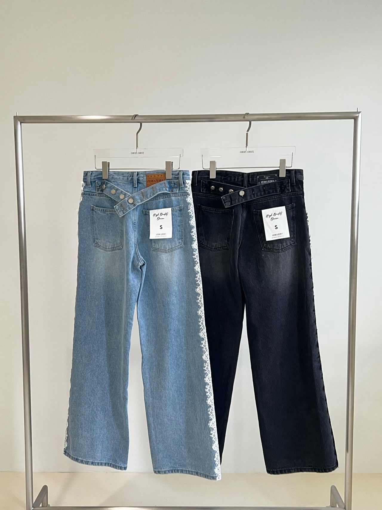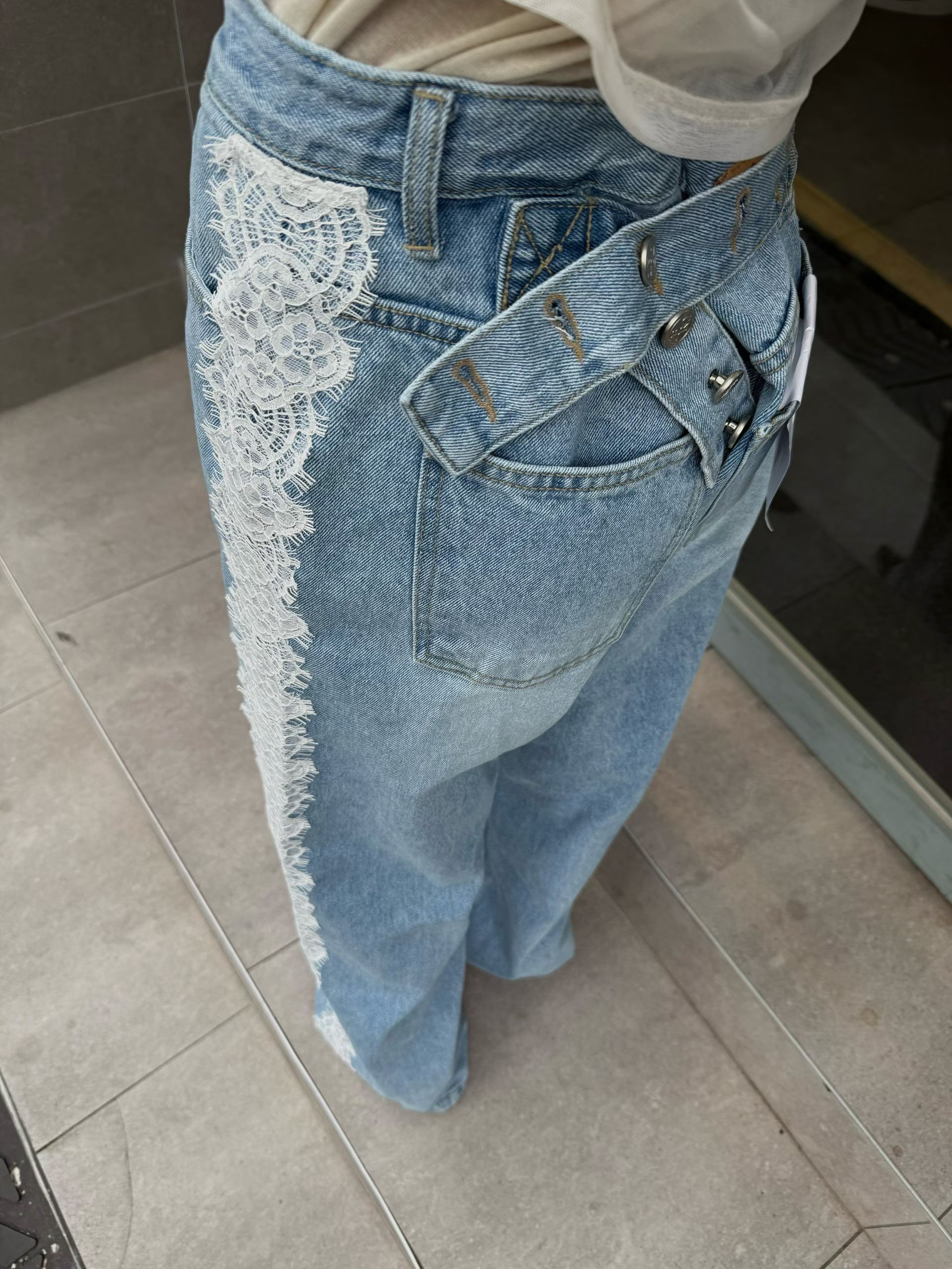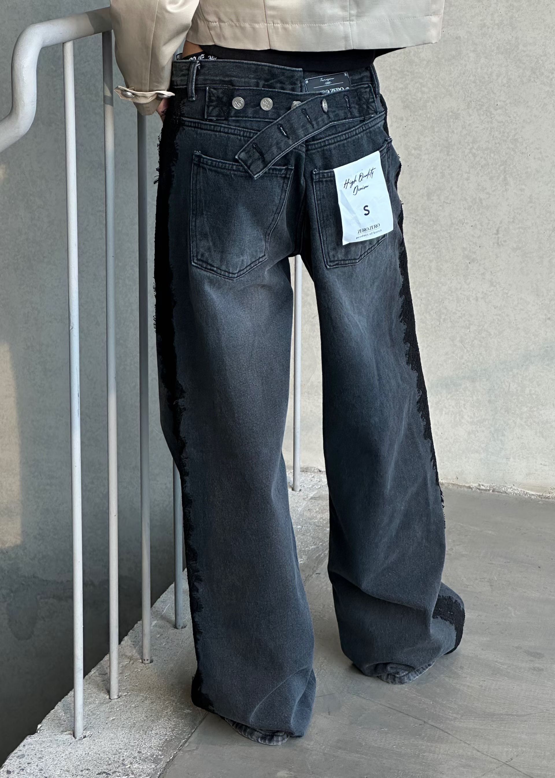 鉚釘設計反摺褲管附腰帶牛仔長褲