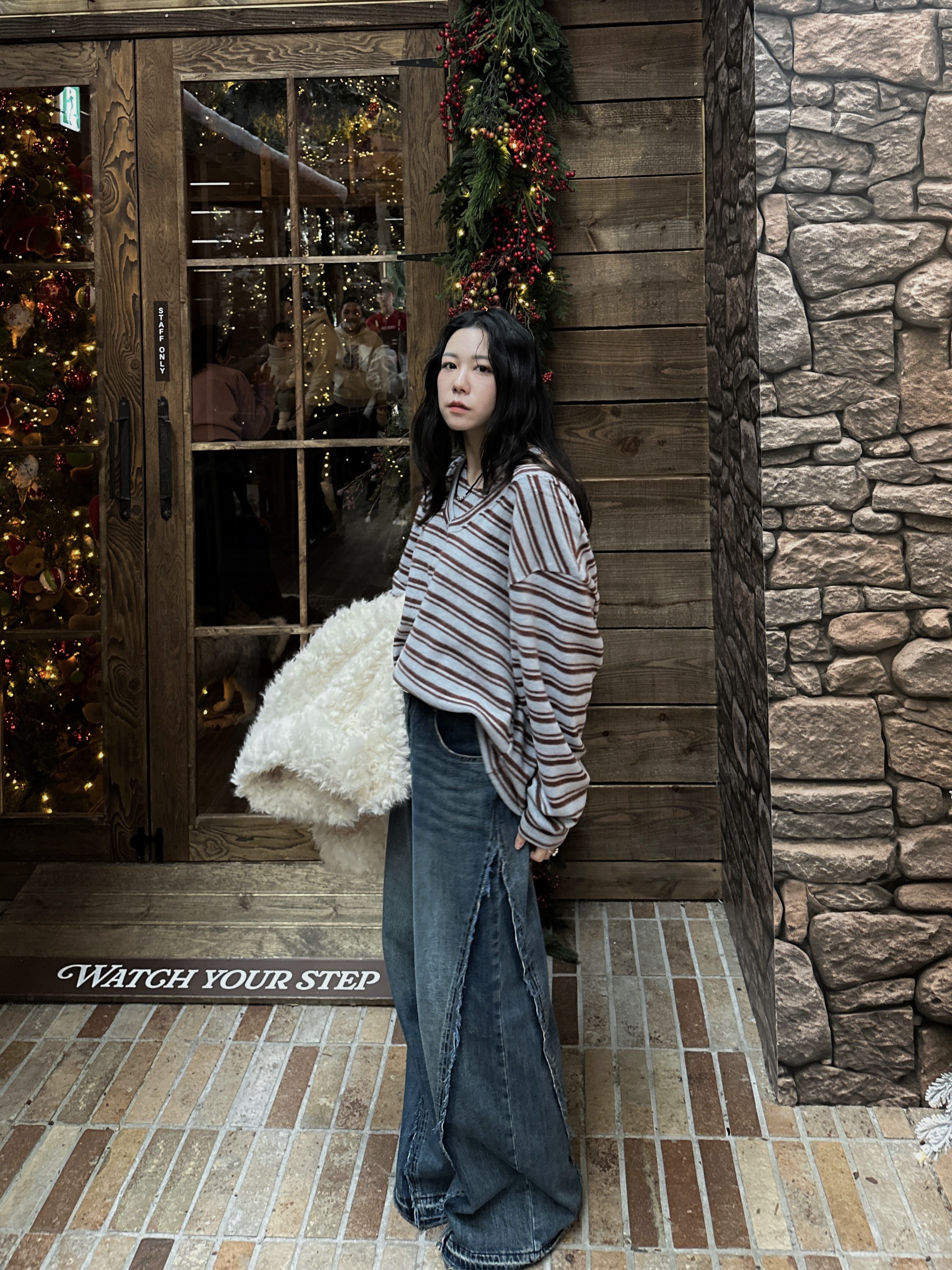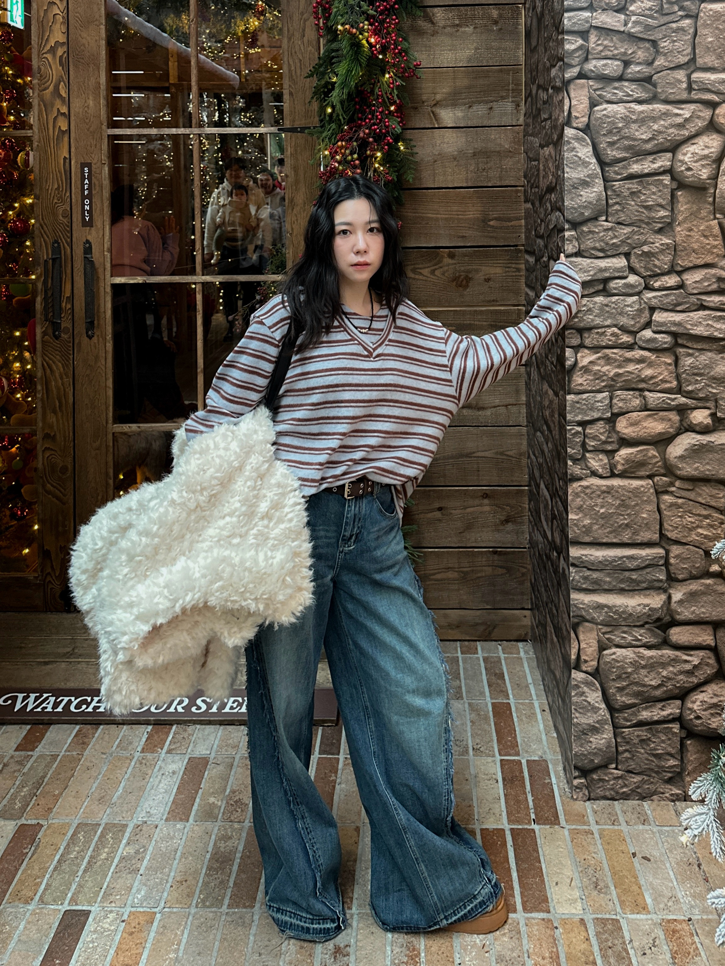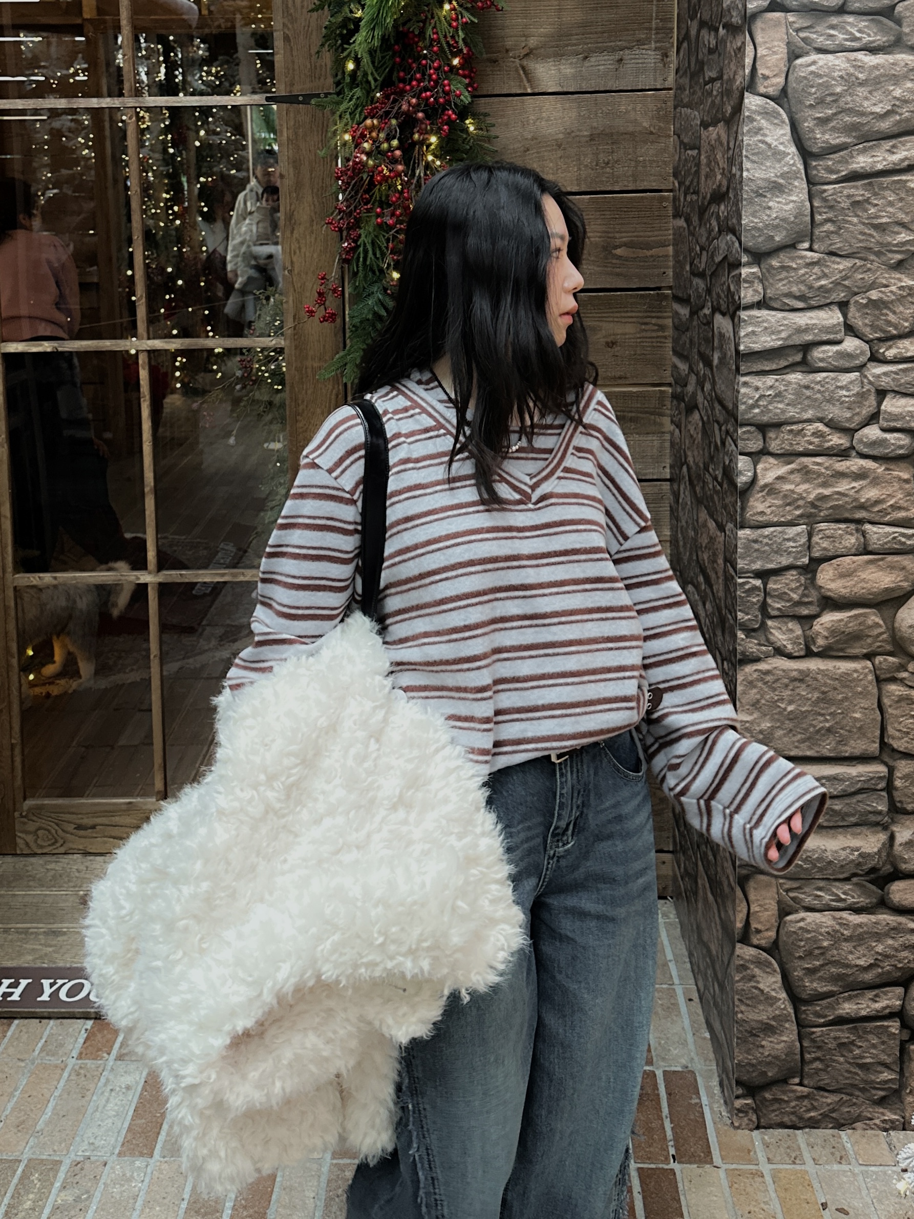 海毛質感開領條紋上衣