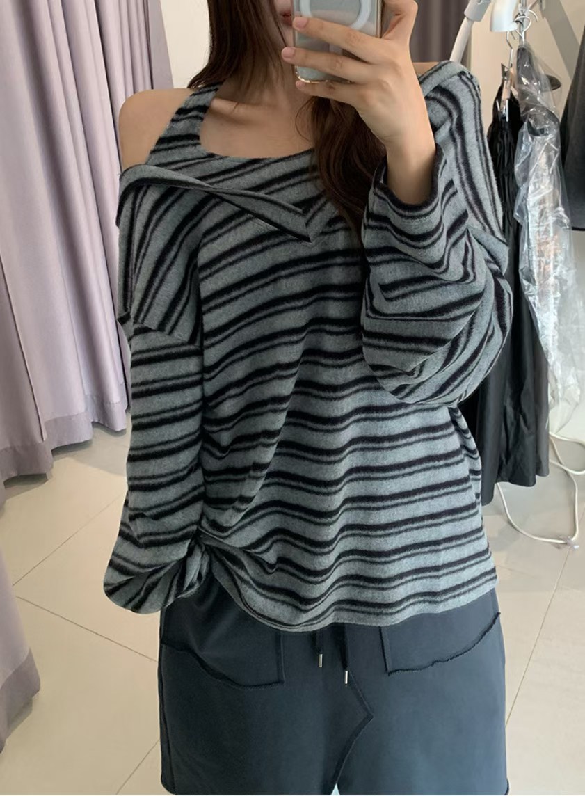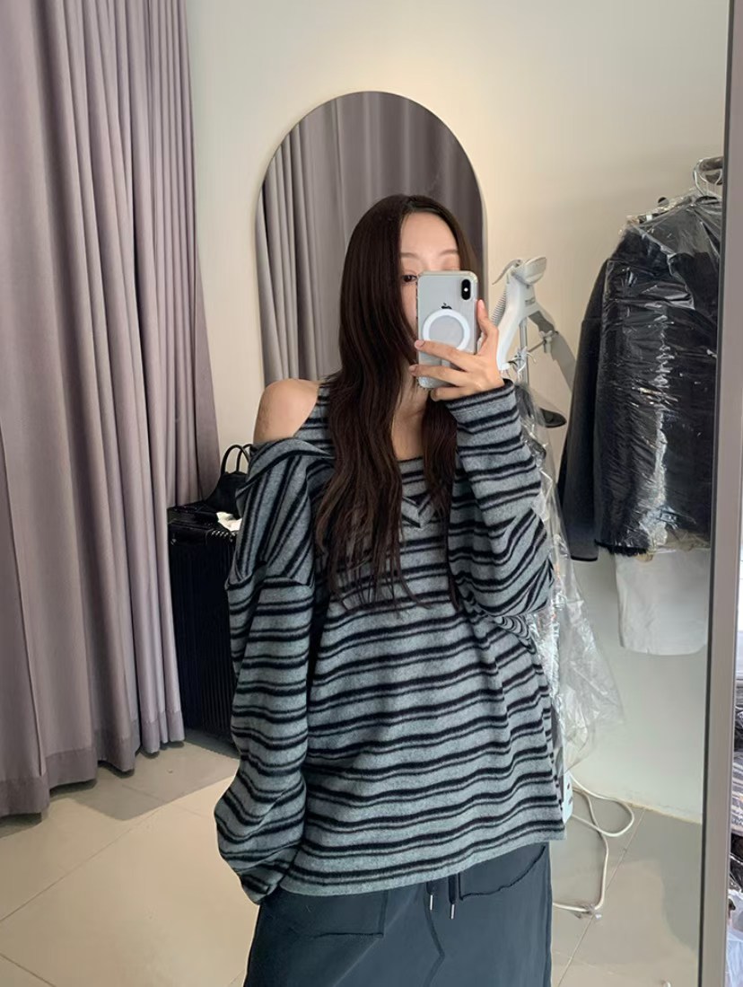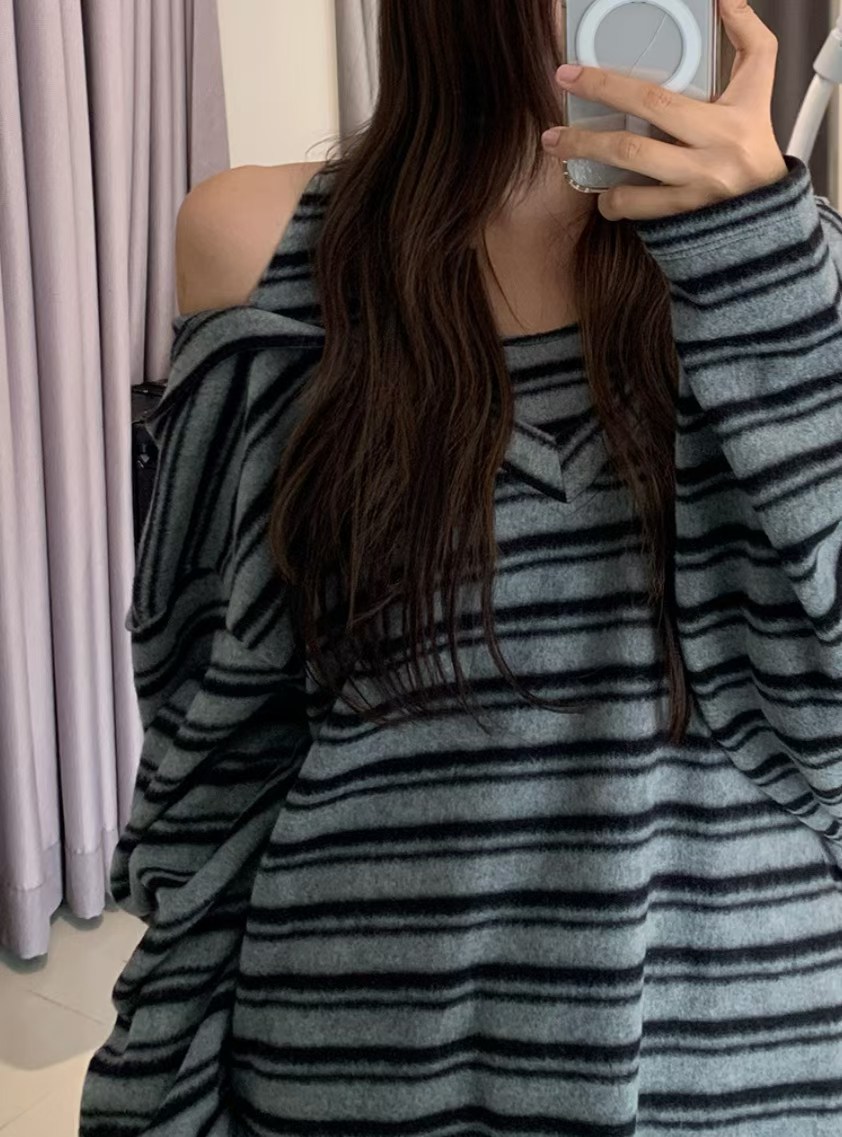 小露肩磨毛條紋連帽上衣