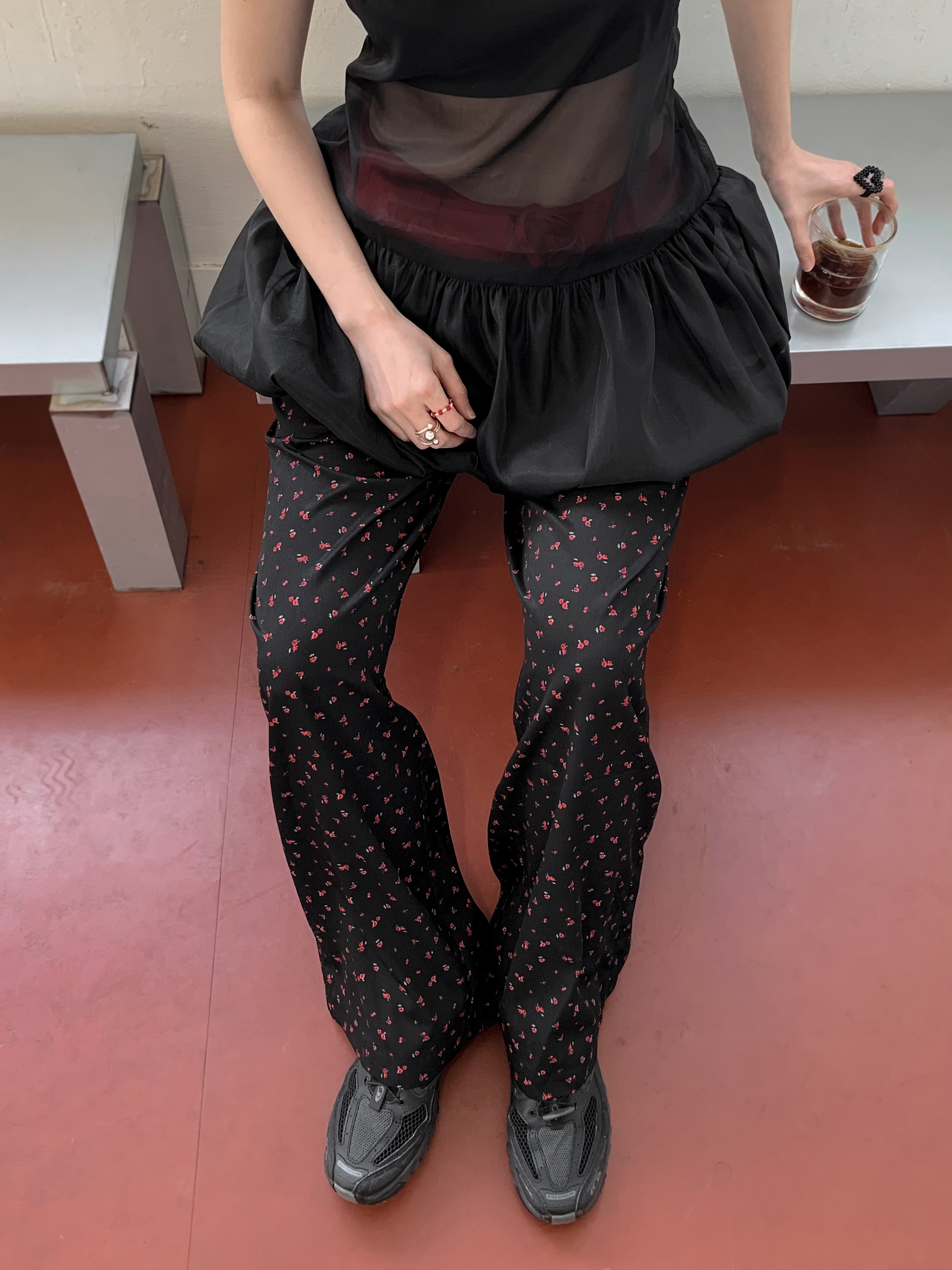 性感撞色緞面小花長褲