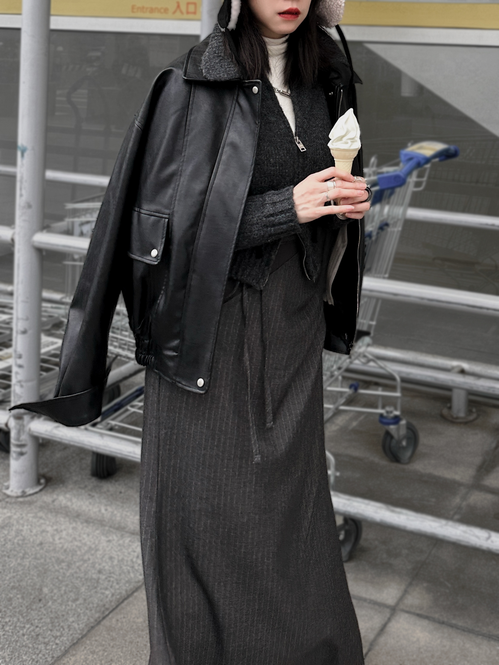 氣勢感條紋內裡皮革外套